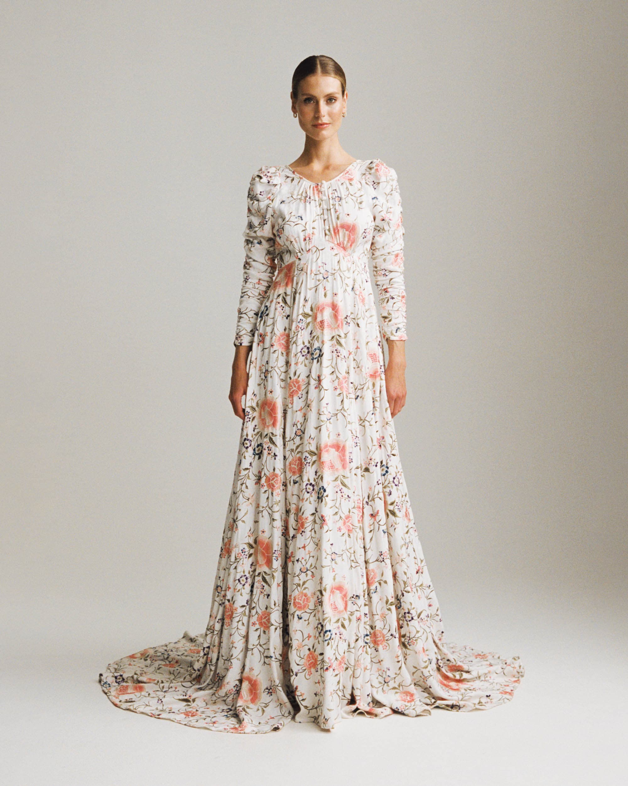 An embroidered wedding dress made in an exclusive and sustainably certified Viscose Satin in a beautiful jacquard pattern. The fabric has embroideries all over, made in delicate pastel colours. The dress has a round neckline, with fabric covered buttons. The dress emphasizes the waistline before it flows out to a voluminous skirt. The sleeves are made of rouching and the skirt of the dress is lined with tulle.